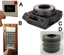 Figure 2: Four pillars of a successful projection plan. (a) A red dot over each slide indicates the correct placement of the slide in the carousel tray. (b) Specially designed plastic wallets to store each speaker’s slides during the conference and securely return all their slides. (c) Carrousel-type photographic slide projectors, a bulwark of the projection plan. (d) One tray for one talk, loaded, tested in the preview room, transported to the meeting hall and returned to the preview room to be loaded in the special plastic folder and kept ready to hand over to the speaker, within minutes. One tray could hold up to 80 lantern slides.